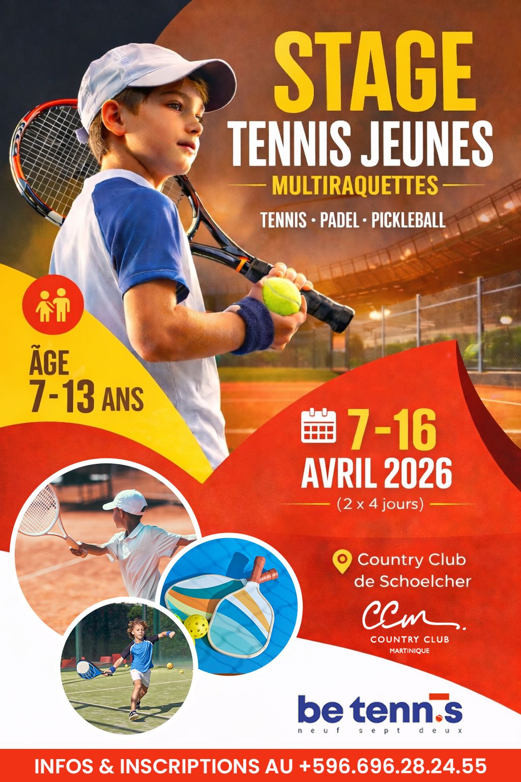 Be Tennis 972 propose des stages multiraquettes pendant chaque période de vacances scolaires, pour les jeunes de 6 à 17 ans. Tennis, padel et pickleball : un programme sportif, ludique et éducatif encadré par des coachs diplômés.